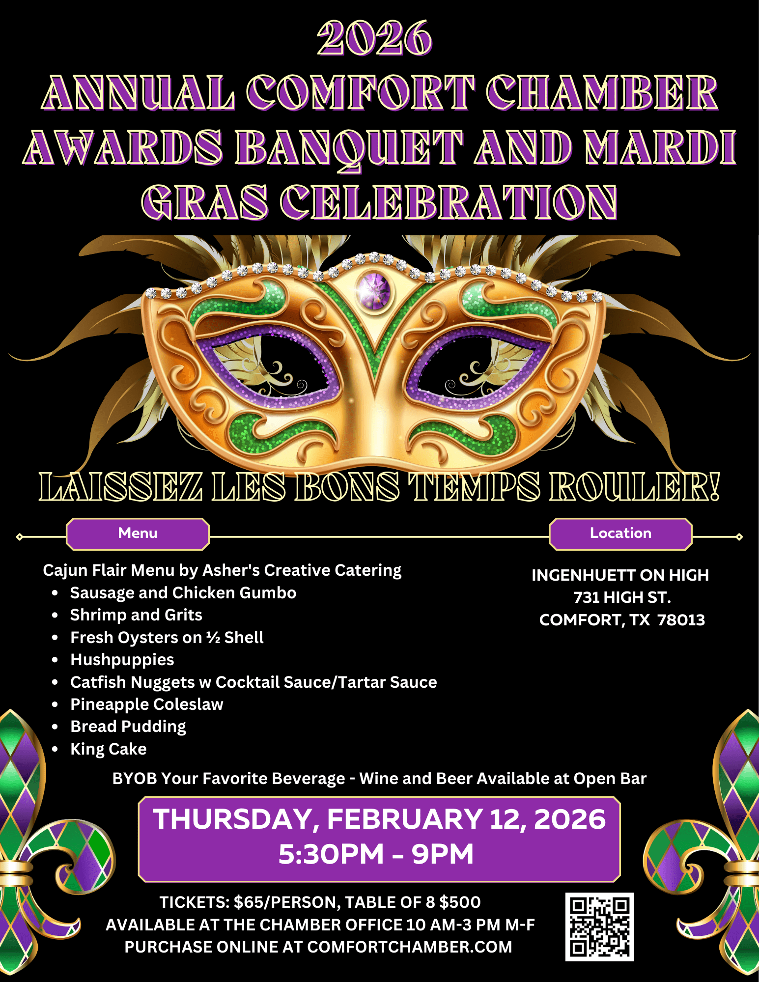 Join us for one of the most anticipated nights of the year, the Annual Comfort Area Chamber of Commerce Awards Banquet and Mardi Gras Celebration. This special evening brings together Chamber members, business leaders, and community partners to celebrate the people and businesses that make Comfort thrive. Enjoy a festive Mardi Gras inspired atmosphere complete with a Cajun flair dinner catered by Asher's Creative Catering , featuring classic favorites like sausage and chicken gumbo, shrimp and grits, fresh oysters on the half shell, hush puppies, catfish nuggets w red/tartar sauce, dessert including bread pudding and king cake. Throughout the night, we will recognize outstanding Chamber members and community leaders whose dedication, service, and leadership have made a lasting impact on Comfort and the surrounding area. It is a night of appreciation, connection, and celebration of the year behind us and the opportunities ahead. The banquet will be held Thursday February 12, 2026 from 5:30 pm to 9:00 pm at Ingenhuett on High in Comfort. Tickets are available for individuals at $65 or tables of 8 for $500, with BYOB (Wine and Beer) options welcome. Come celebrate, connect, and laissez les bons temps rouler with the Comfort Area Chamber of Commerce!