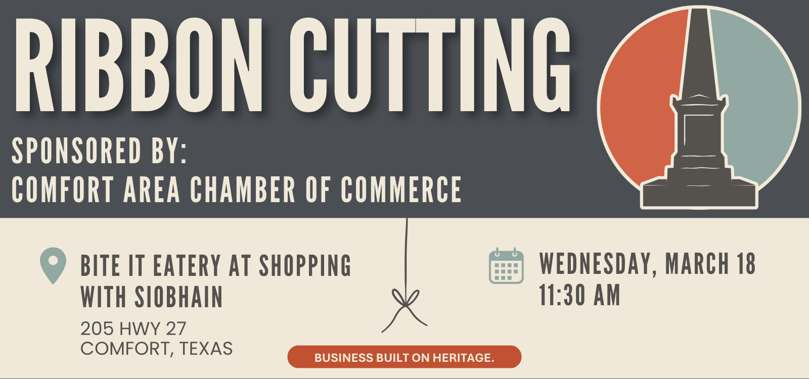 Join the Comfort Area Chamber of Commerce as we celebrate the ribbon cutting for Bite It Eatery at Shopping With Siobhain! Bite It Eatery is serving up flavorful bites and quick, tasty eats inside one of Comfort's charming local shops perfect for grabbing something delicious while you browse and explore. Come meet the team, show your support, and help us give this new local eatery a warm Comfort welcome!