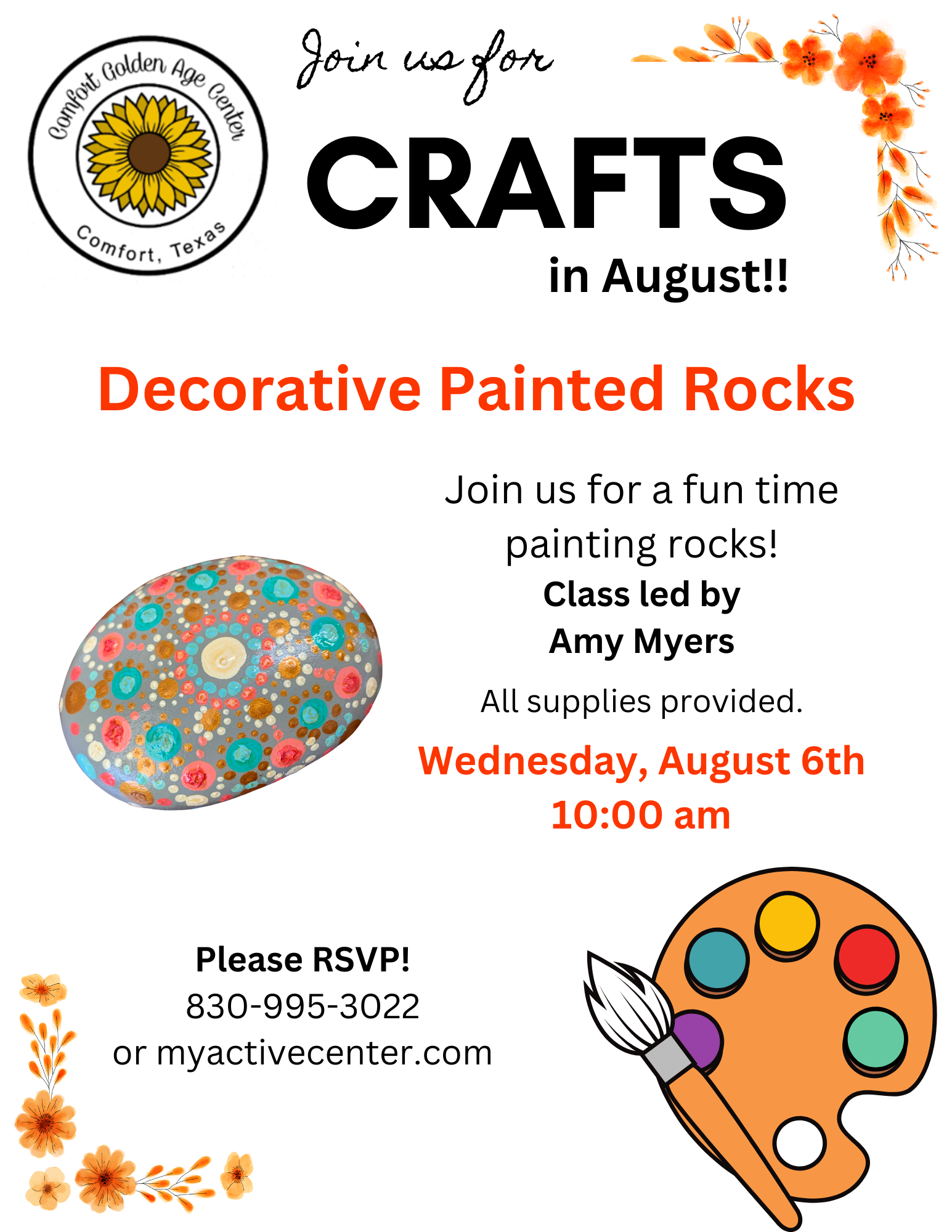 Join us for crafts in August! Amy Myers will be here to lead us in making decorative pained rocks! Supplies are provided, but please sign up by Monday, August 4th.