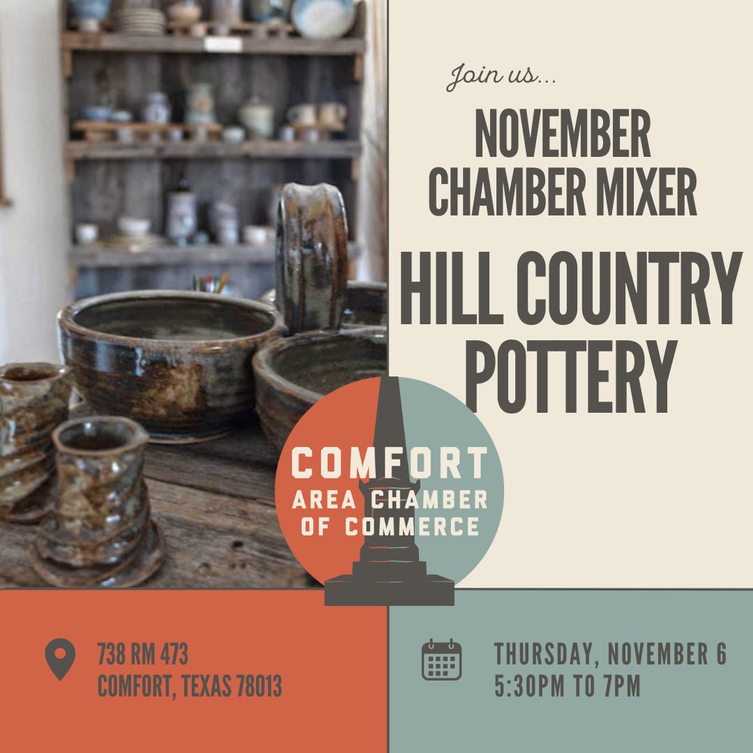 Join us for the Monthly Chamber Mixer at Hill Country Pottery, from 5:30–7:00 pm! Come explore this unique local spot while mingling with fellow community members over tasty bites and lively conversation. It’s a great way to expand your network, discover new opportunities, and show your support for local businesses. Just $2 cash at the door—open to all and everyone’s welcome. Don’t miss it!Images