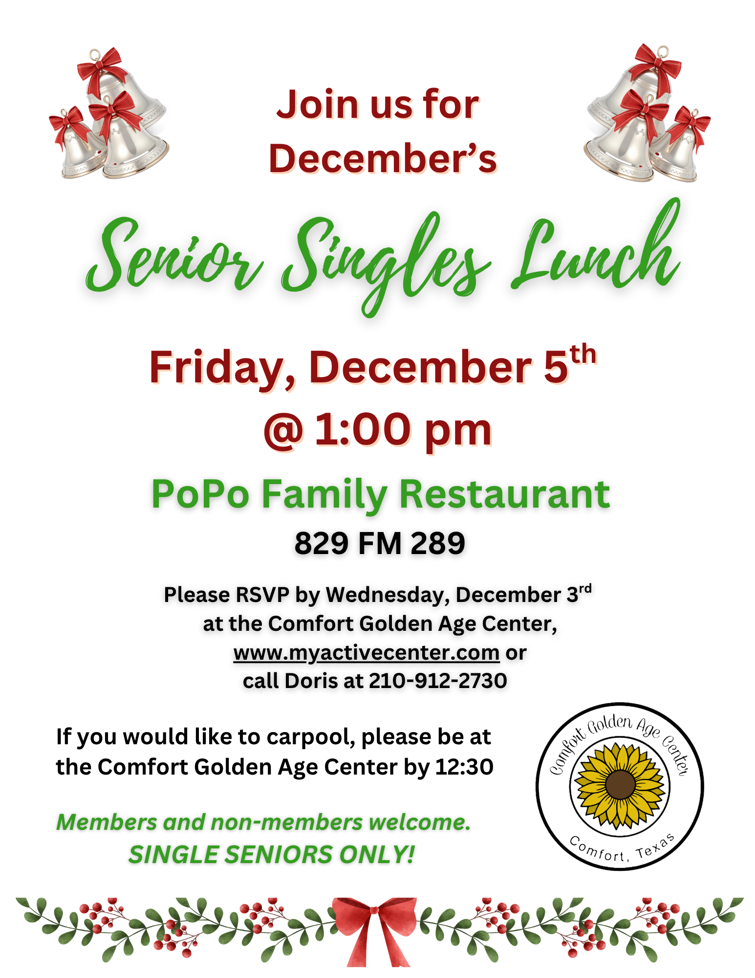 This month, our single seniors will be going to lunch at PoPo Family Restaurant located at 829 FM 289. Lunch will be at 1:00 pm on December 5th, but please sign up by Wednesday, December 3rd. If you would like to carpool, meet at Comfort Golden Age Center (628 Front Street) at 12:30 pm. If you need transportation or have any questions, contact Doris at 210-912-2730.