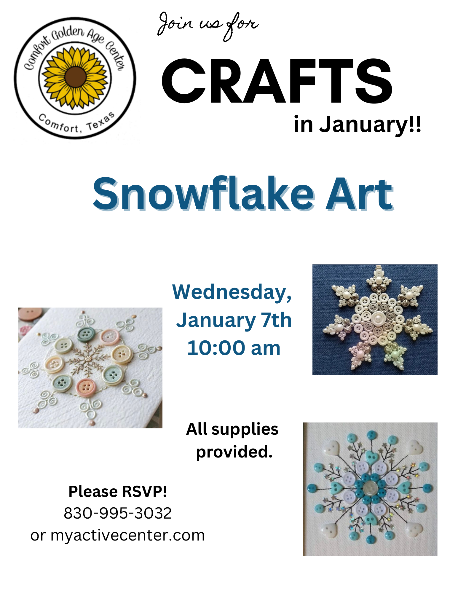 This month's craft is Snowflake Art! We will be using a variety of supplies and techniques to create decorative snowflakes. Supplies are provided, but please sign up in advance.
