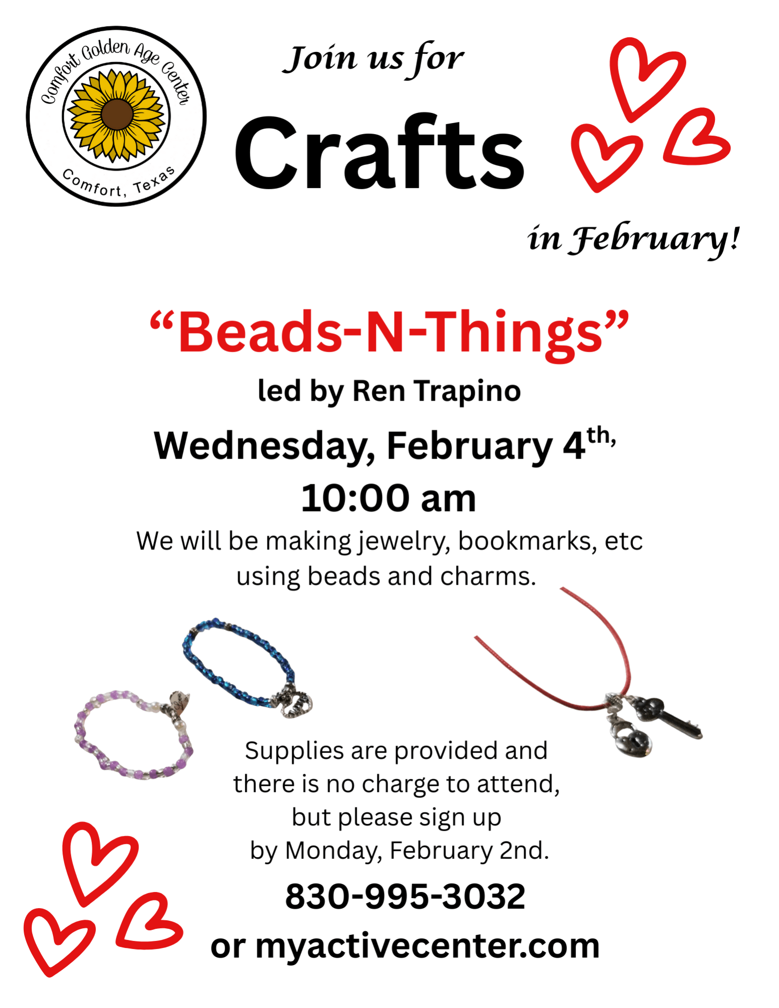 In our February Craft Class, led by Ren Trapino, we will be making jewelry, bookmarks, etc., using beads! There is no charge to attend and supplies will be provided, but please sign up my Monday, February 2nd if you would like to attend.