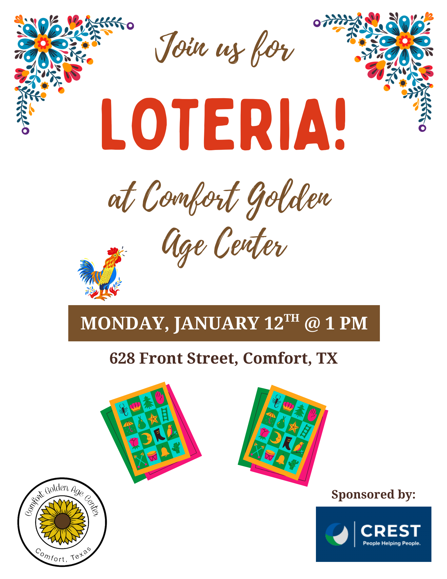 Join us at 1 pm for Loteria! Our Sponsor, Monica Zuniga with Crest Palliative Care, will be here with prizes and call the game for us!