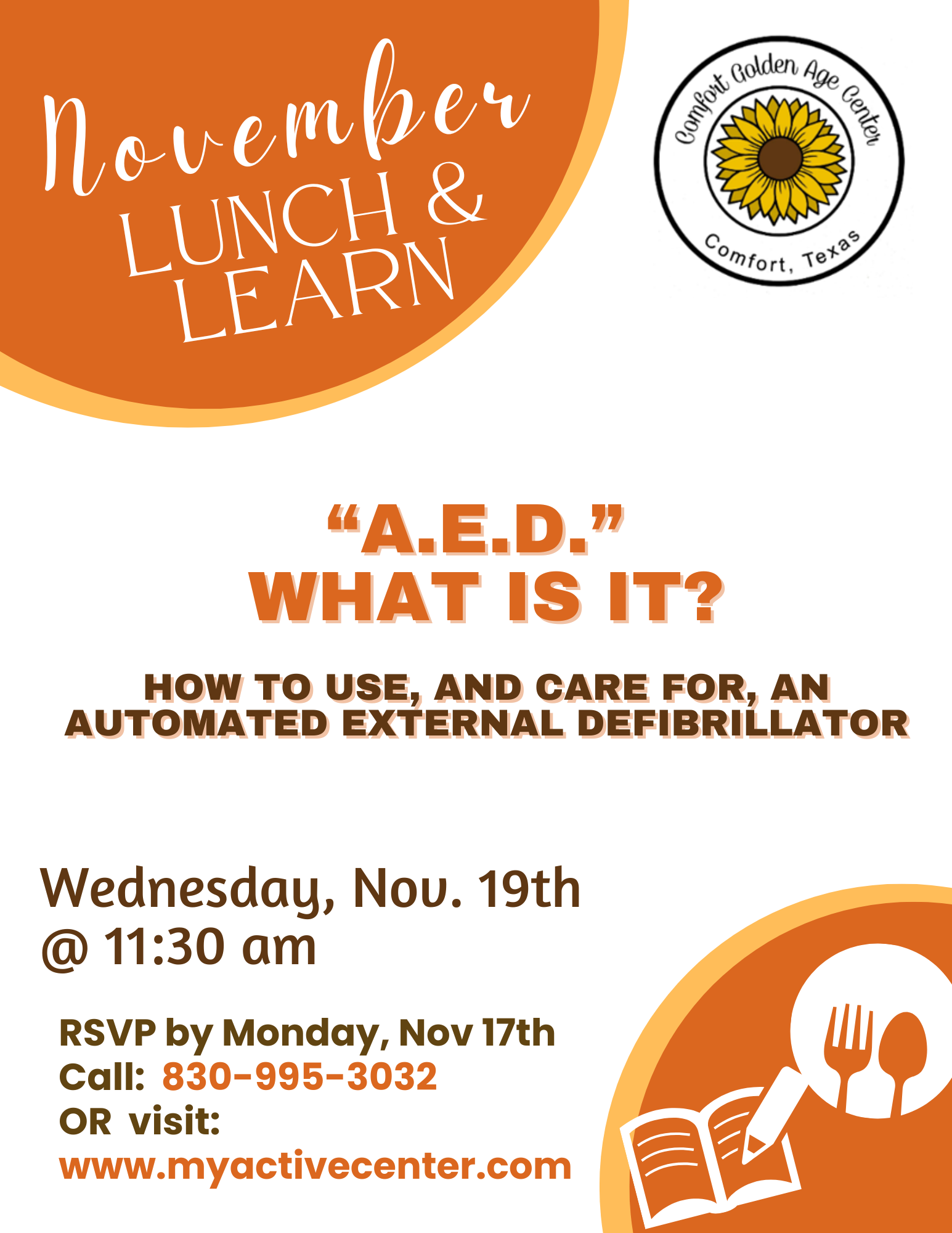 Our November Lunch & Learn, led by Gina Enderlin, will be "AED...What is it?" How to use, and care for, an Automated External Defibrillator. Lunch will be provided and there is no charge to attend, but please RSVP by Monday, November 17th.