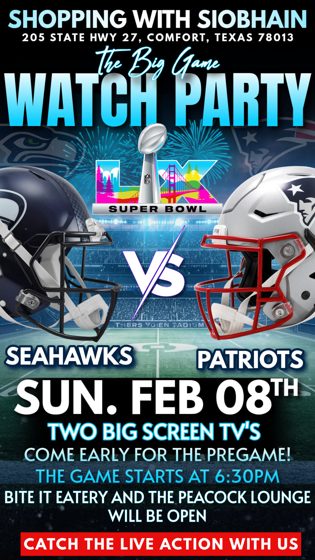 Come watch the Super Bowl with us at Shopping with Siobhain. Seahawks vs Patriots. We have two BIG Screen TV's outside at our event center, the Bite it Eatery will be open as long as our Peacock Lounge for beer and wine.